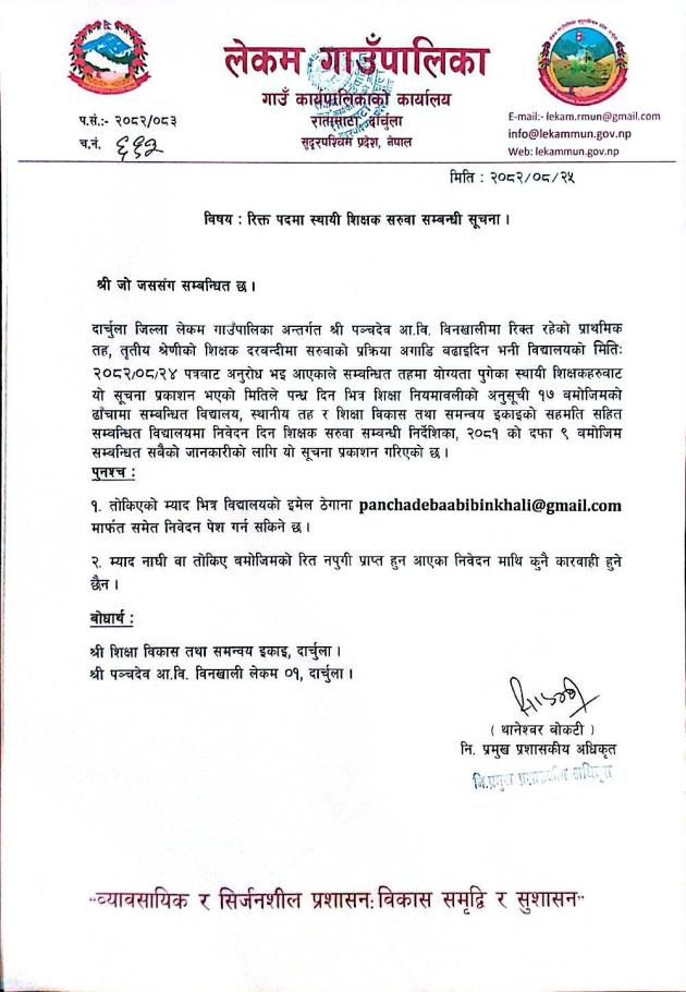 रिक्त पदमा स्थायी शिक्षक सरुवा सम्बन्धी सूचना ।